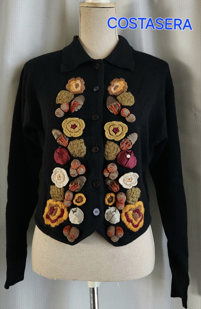 - 美品 一難アナ モチーフ一杯のレトロなウールカーディガン 香港製 黒