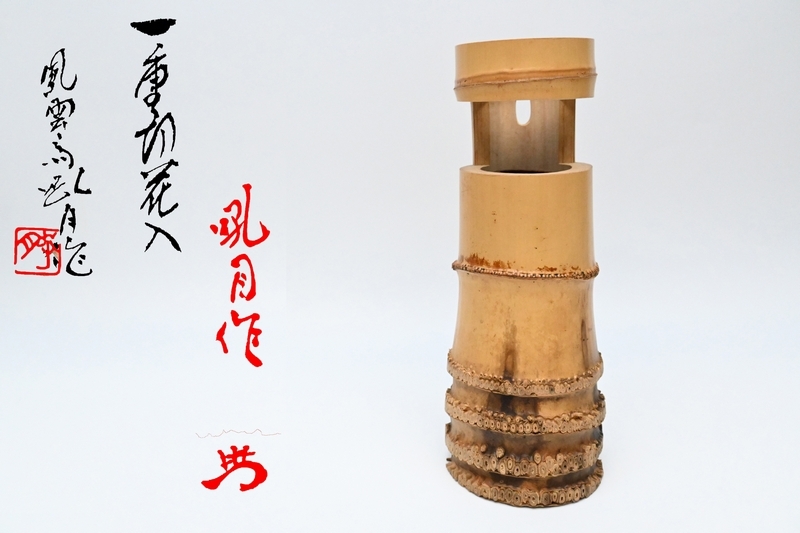 - 鳳雲斎吼月 [ 小菅吼月 ] 名工 巨匠 作 ■ 重切花入 花押し 栞 落とし 希少 ■ 茶道具 華道具 竹花入れ 花器 竹細工 天然木 共箱 ■