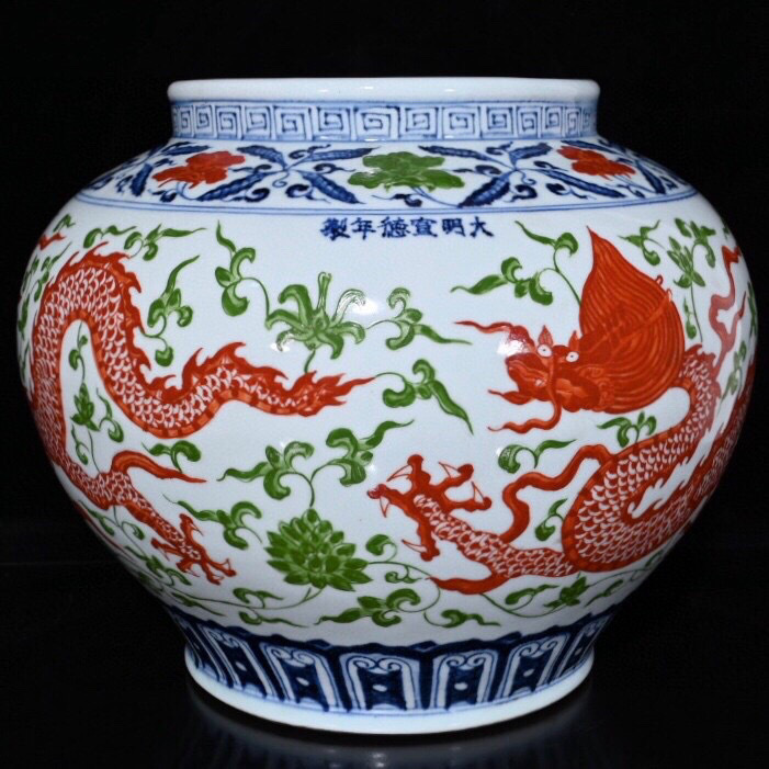 - 【超珍館蔵】明 宣德年製款 古陶瓷品 青花 紅綠彩 龍紋罐 置物 古賞物 古美術品 稀少珍蔵品