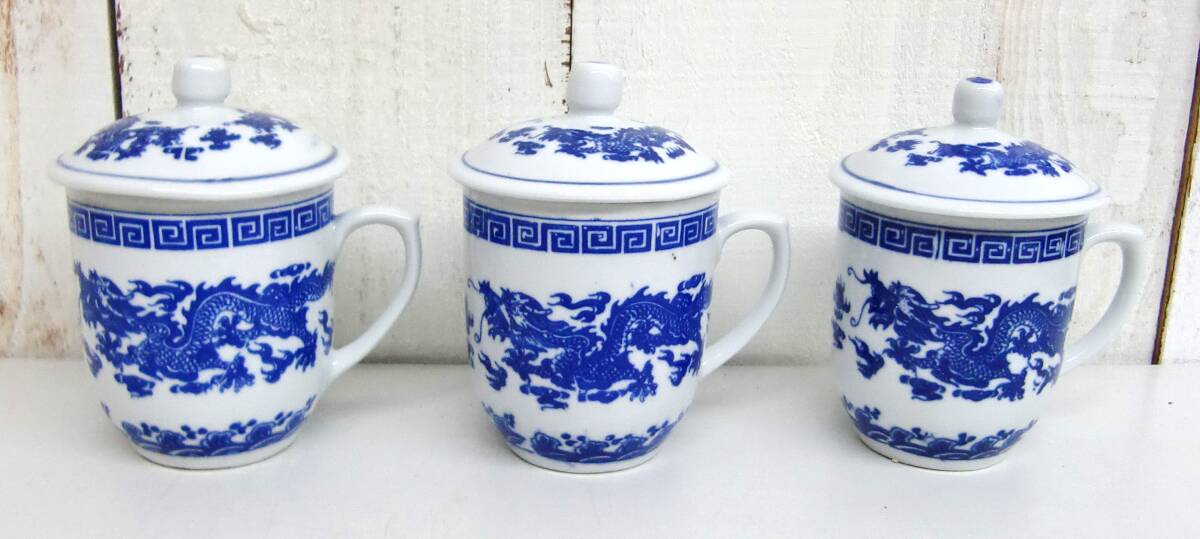 - 伝統工芸 工芸品 工芸美術 *中国景徳鎮 *蓋付き マグカップ 3点まとめ*龍杯 染付 双龍 *紅線連接 京都えり善 *コップ 湯呑み 食器