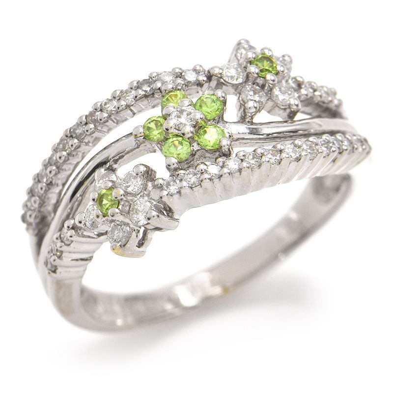 > 合計0.2ct天然デマントイドガーネットリング 16号 K18WG 合計0.45ct天然ダイヤ フラワーデザイン ホワイトゴールド 地金5.1g 中古 送料無料