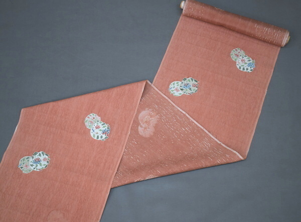 - A48-1【凛々】即決 新古品 正絹 染名古屋帯 反物 灰ピンク 花の丸 未仕立て品