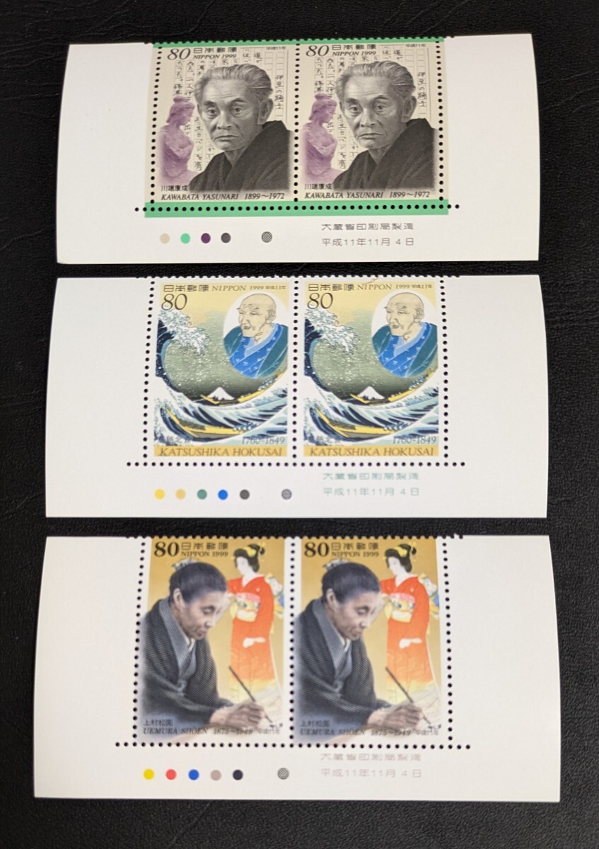 - 1999年・記念切手-文化人(第2シリーズ)第8集・3種類(銘版,CM付)