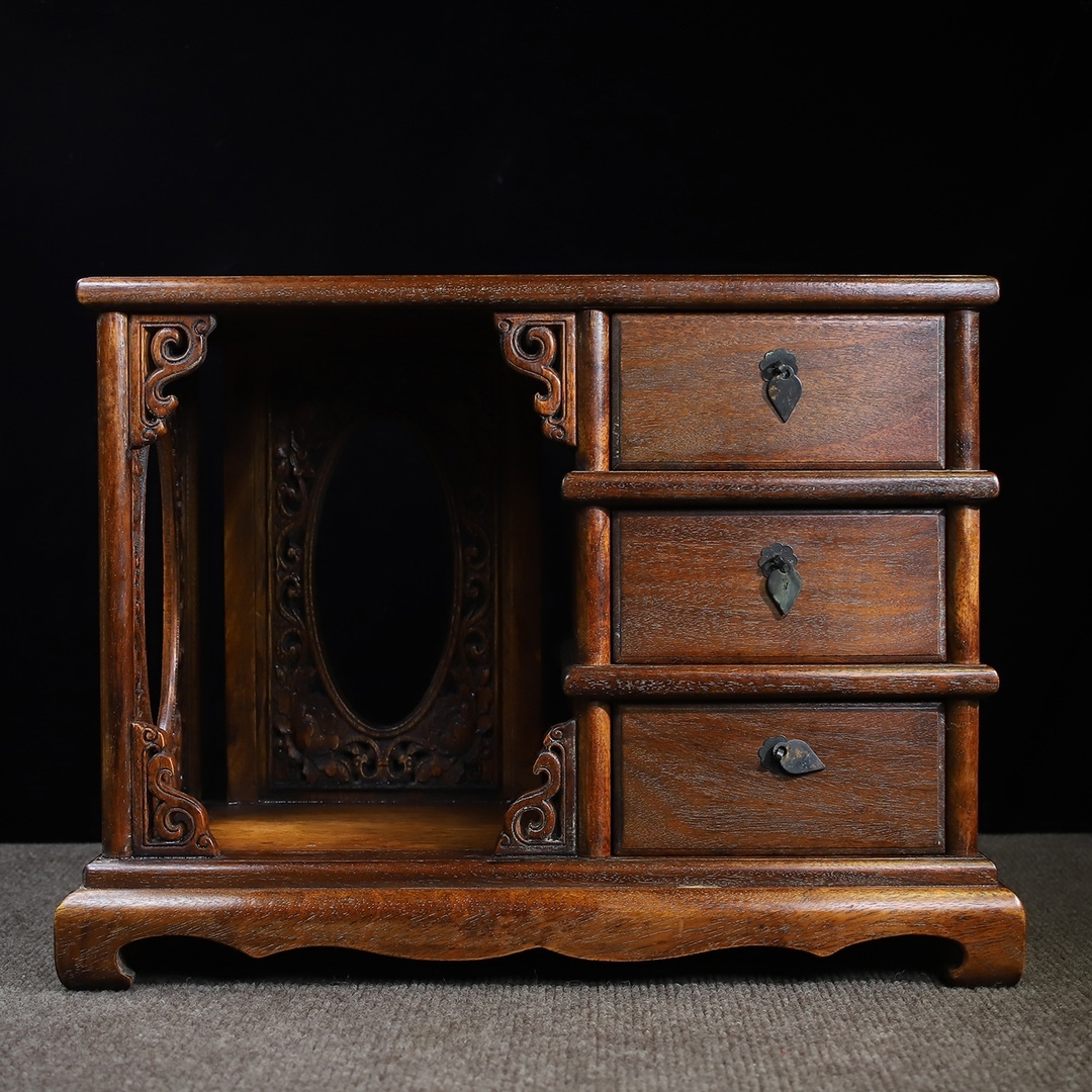 - 旧蔵 清 花梨木三引き出し楕円透かし彫り花咲く富貴多宝櫃 木製 極細工 中国古玩 古美術 骨董品 201-10