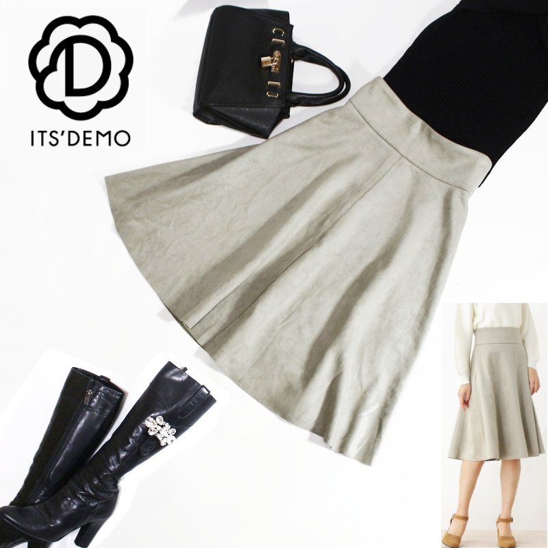 > 美品 ITS'DEMO イッツデモ 株) ワールド 秋 冬 カットスエードフレアスカート スエードスカート F グレイッシュ ダスティグリーン ミモレ
