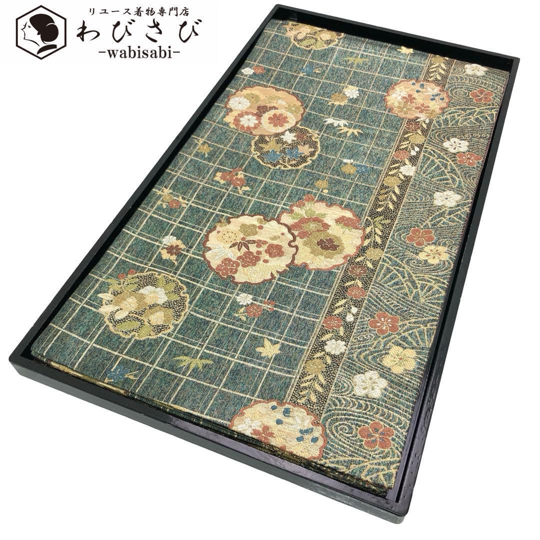 - 袋帯 雪輪に花模様 格子柄 金糸 深藍色 O-4556 着物 きもの kimono 和服 和装 中古 リサイクル着物 【送料無料】