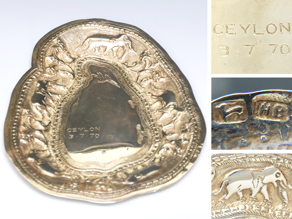 - セイロン (スリランカ) 銀製 象紋 彫刻 小トレイ 重量:32g 1950年頃 シルバートレイ SILVER アクセサリートレイ 金属工芸 象 z9282a