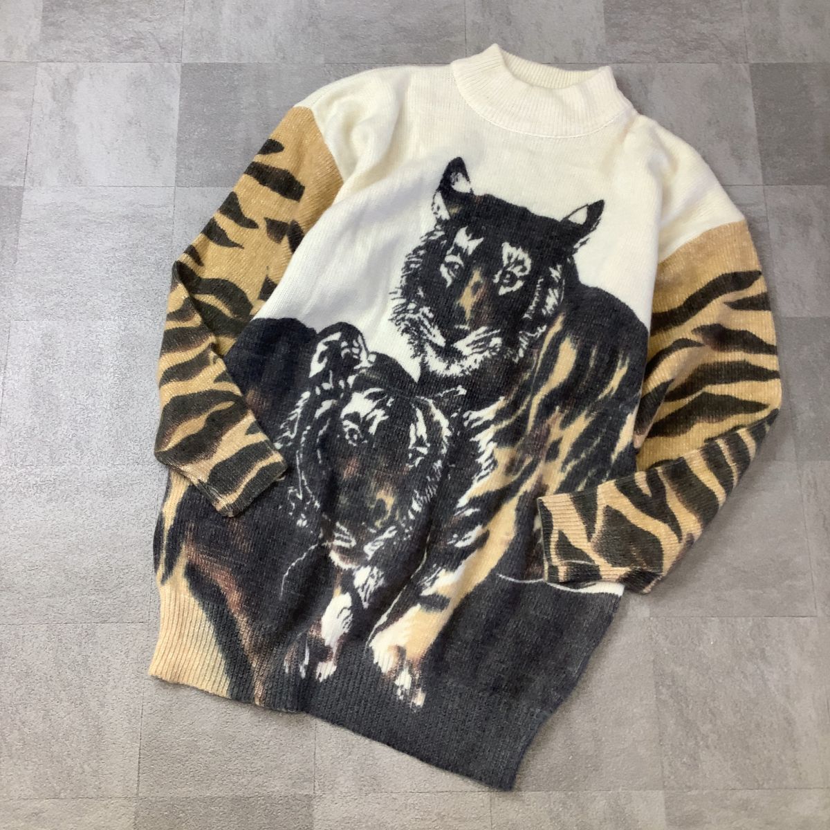 > 【滑らかなアンゴラ】総柄 虎柄 ボトルネック アンゴラブレンド ニット セーター レディース XL以上相当 大きめ ホワイト ベージュ