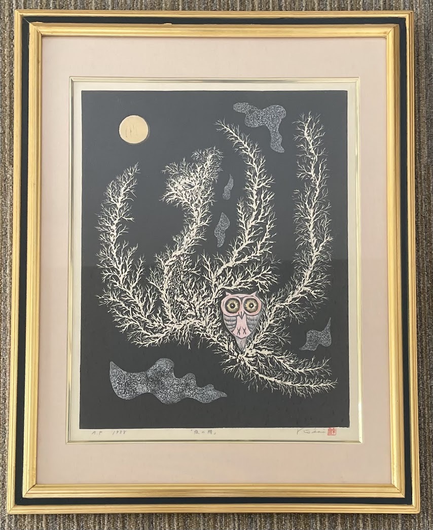 - [真作保証] 中野幸斎 夜の精 木版画 A.P1988 中野幸一 フクロウ版画家 飛騨版の会 飛騨高山 版画洞 高山市美術展運営委員 R7-0025