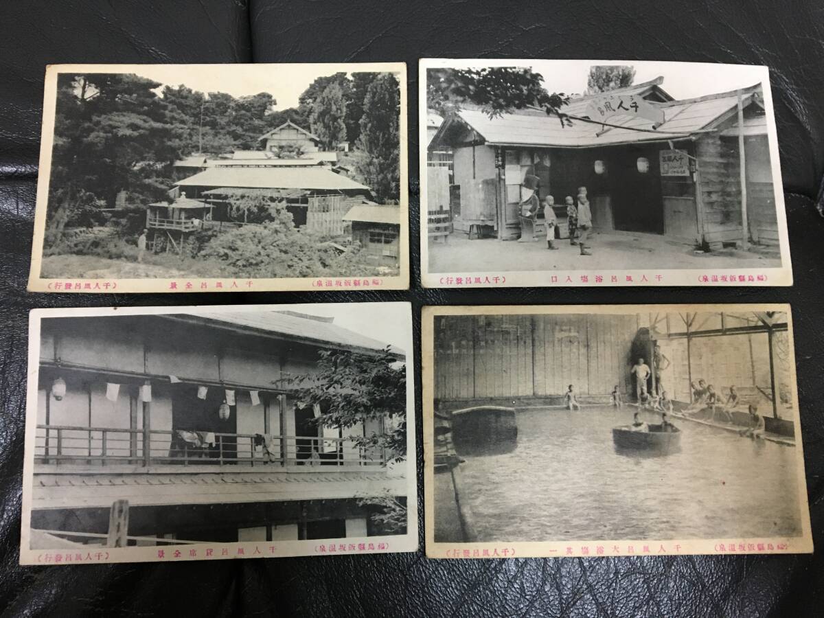 - ★未使用・昭和初期ごろ★郵便はがき「福島県飯坂温泉4景セット 」仙人風呂・大浴場・入口・全景 絵葉書 ポストカード (本間2保管)