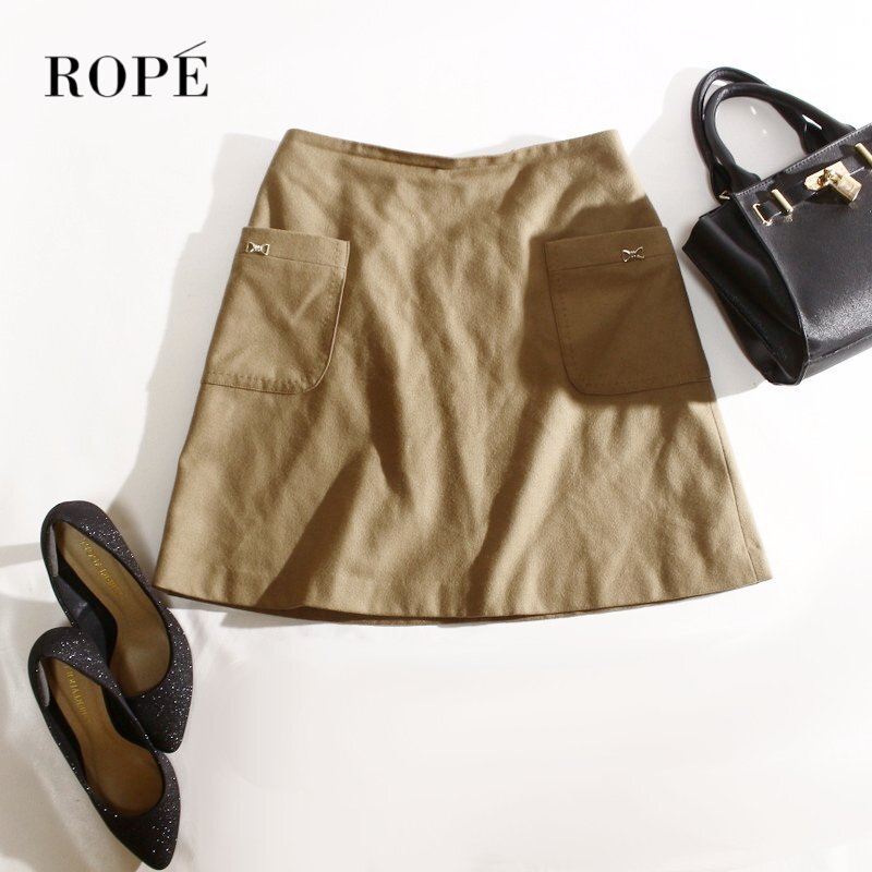 > 美品 ROPE’ ロペ 上品 毛 Aライン 膝丈 ウールスカート 9号 38 ベージュ ゴールドデザインボタン 可愛い オフィス 綺麗め スカート