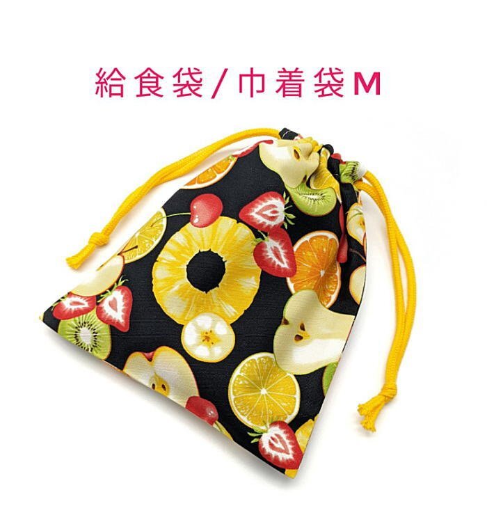 - 給食袋・巾着袋M【フルーツミックス柄 ブラック】マチ無し 日本 製 ランチ袋 ナフキン入れ ポーチ コップ袋 入園入学 パイン リンゴ イチゴ