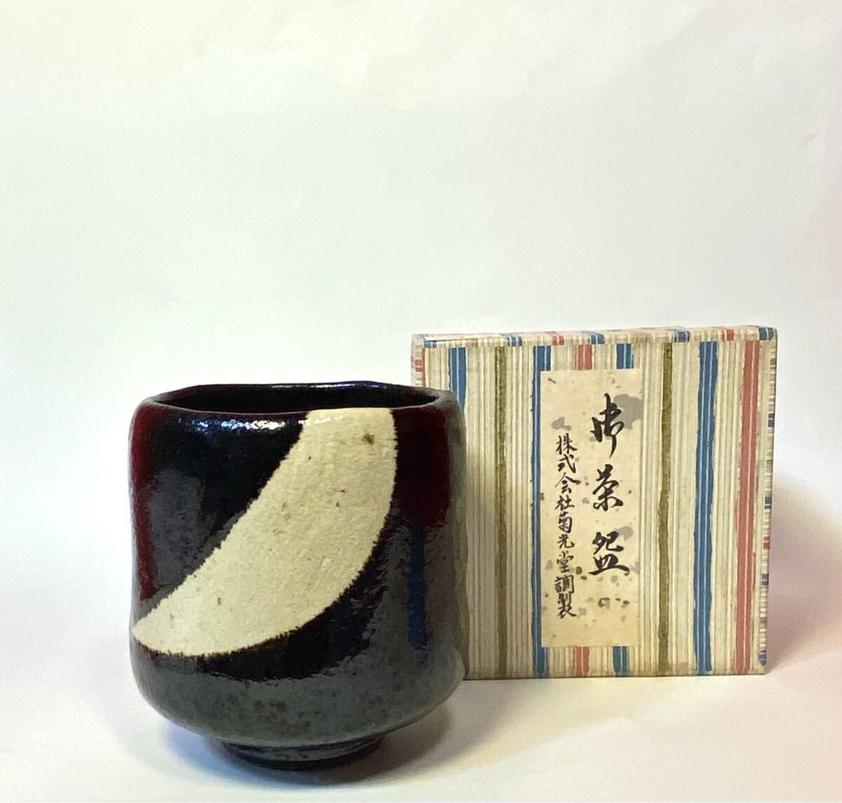 - 茶道具『楽焼 「大野九行」造 黒楽 三日月文 筒茶碗 「九行」陶印あり 紙箱入 状態良好』茶事 茶会 抹茶碗 茶器 黒楽茶碗 月夜