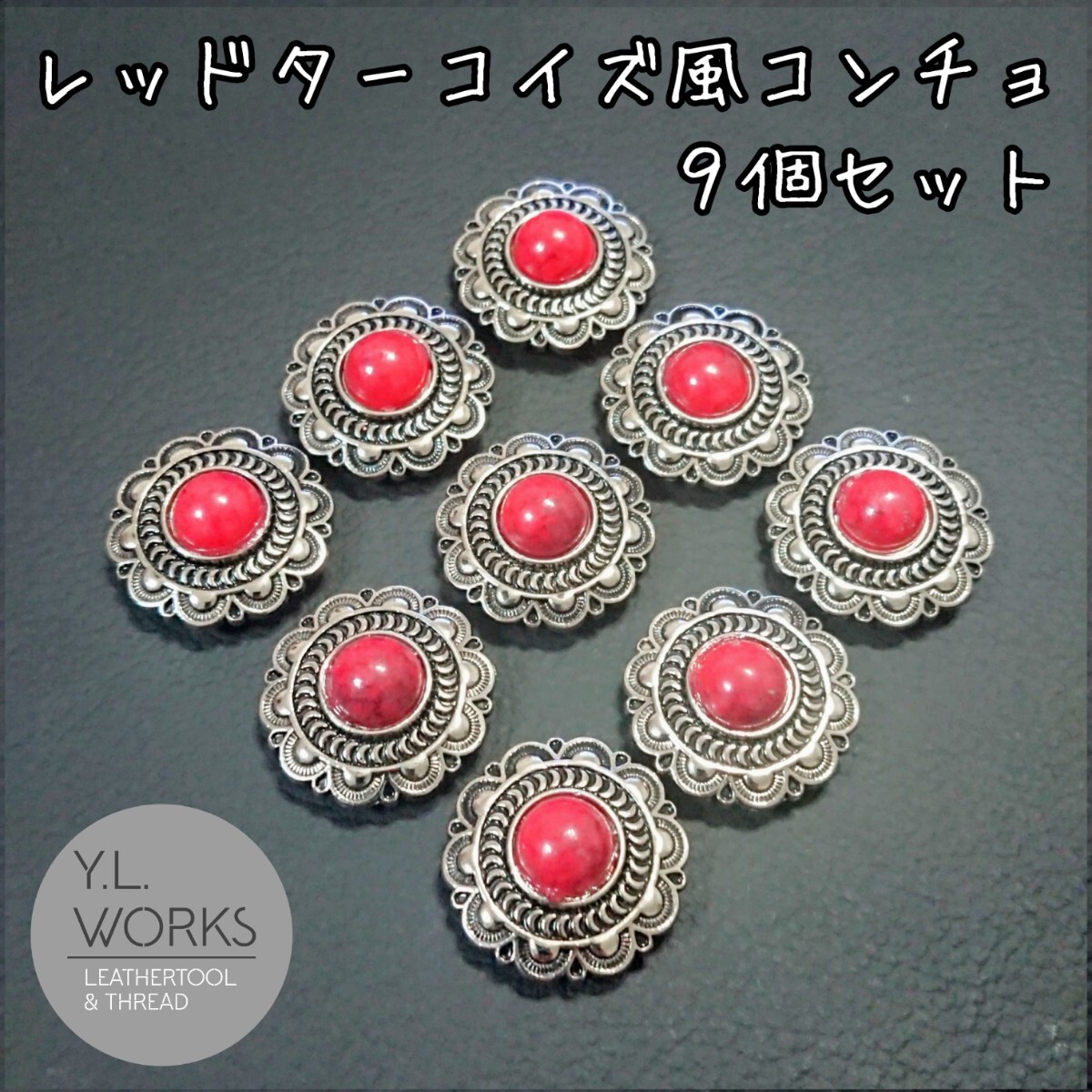 - レザークラフト レッドターコイズ風コンチョ 9個セット c29-02