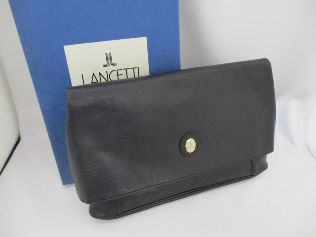 - LANCETTI ランチェッティ セカンドバッグ クラッチバッグ ゴールド金具 型押し 本革 ブラック 黒 箱あり【6605】