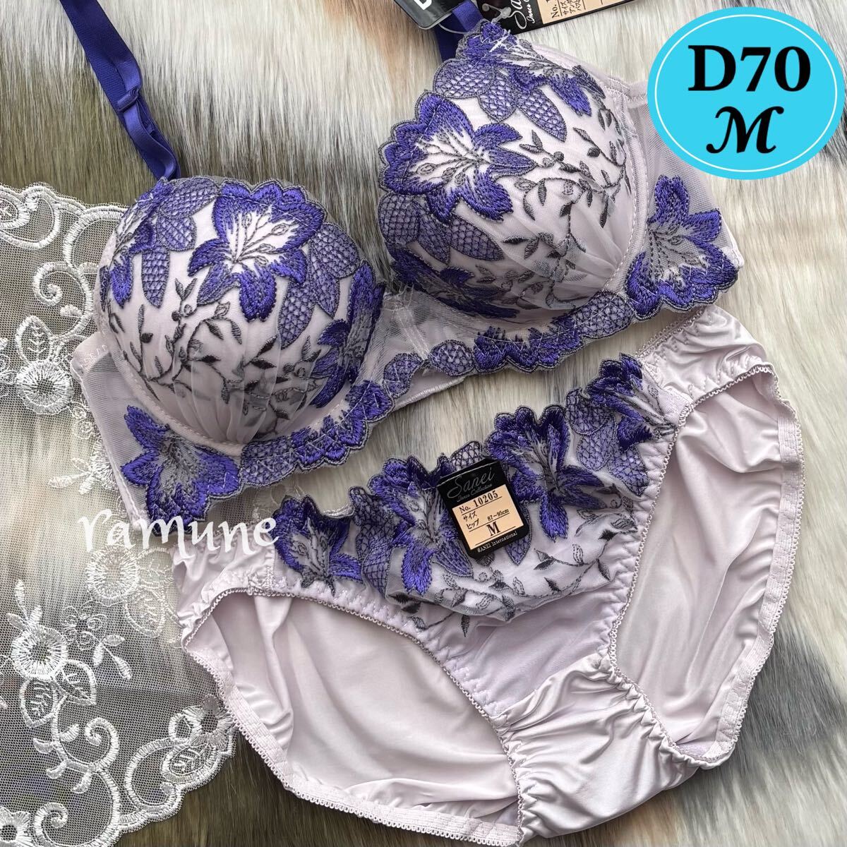 > 【D70/M パープル 上下セット】新品 ブラ&ショーツ ブラジャーショーツ 下厚パッド内蔵 フラワー刺しゅう かわいいパンティ Dカップ