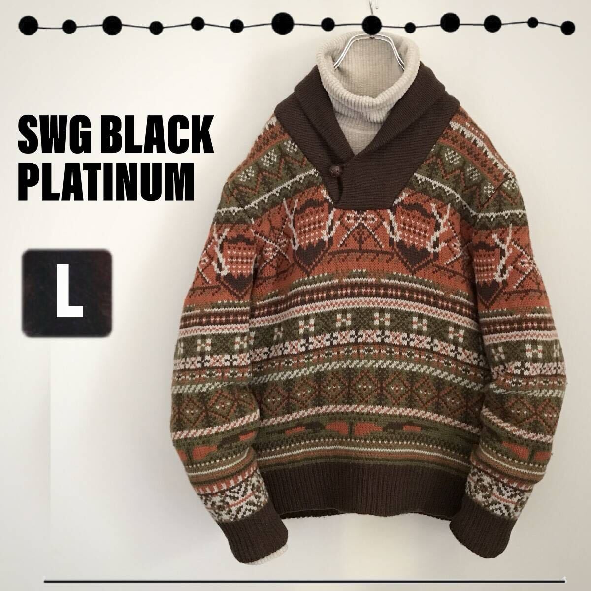 > SWG BLACK PLATINUM★SWAGGER スワッガー★ショールカラー★ノルディック柄★ウールセーター★メンズL 2310O081