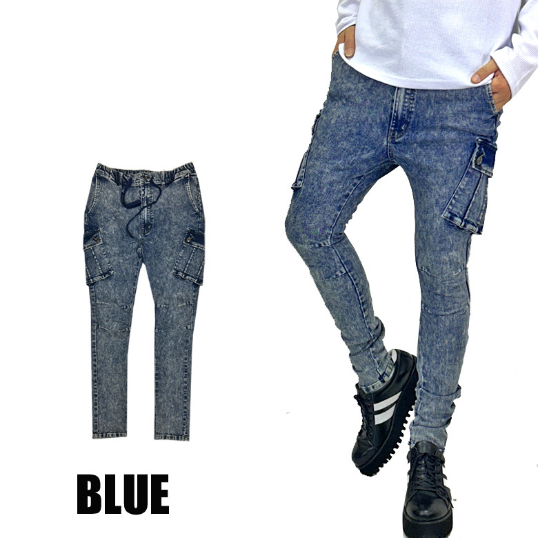 - ストレッチ スリム デニムカーゴパンツ 530-42llun 細身 ストレッチデニムパンツ カーゴデニム 新品 ブルー XL