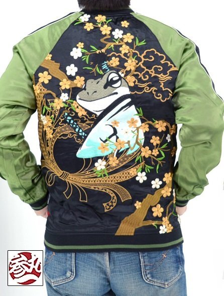 - 桜吹雪侍蛙リバーシブルスカジャン◆参丸一 ブラック×カーキMサイズ SM-30628 さんまるいち サンマルイチ 和柄 和風 スーベニアジャケット