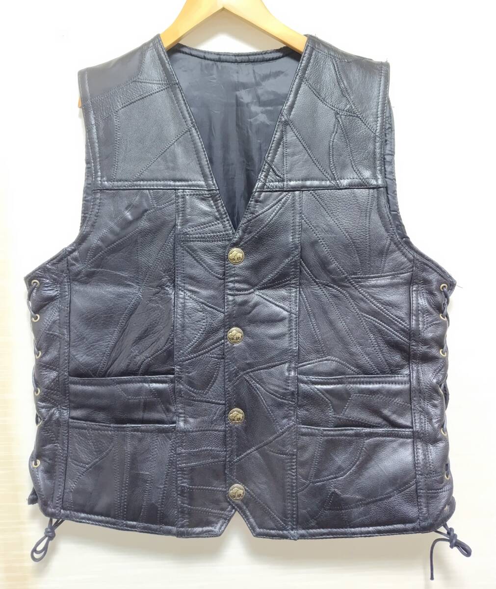 > 本革 レザーベスト ライダースベスト パッチワーク 編み上げ コンチョボタン風 黒 ブラック M-L メンズ バイクウエアに♪