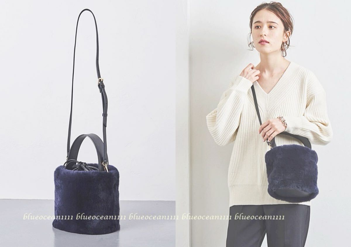 > 未使用【SIMPLICITE】ネイビー 取り外し可能ななめ掛けストラップ付 2wayファーバケツバッグ 巾着 Tシャツ スカート パンツ デニム