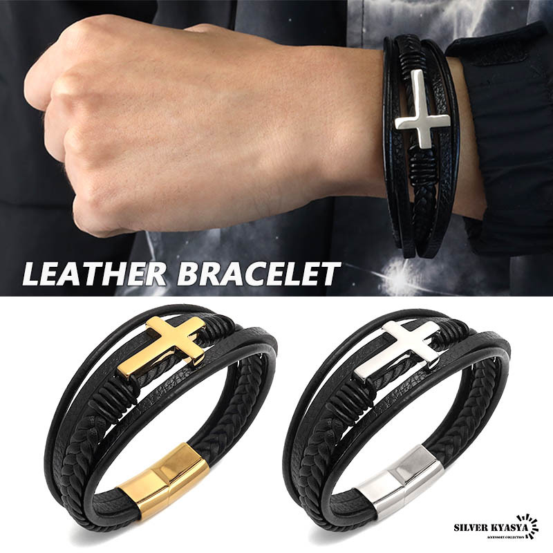 > (ゴールド) ブレスレット レザー ステンレス クロス 十字架 定番 ゴールド シルバー gold マグネット メタリック 男性