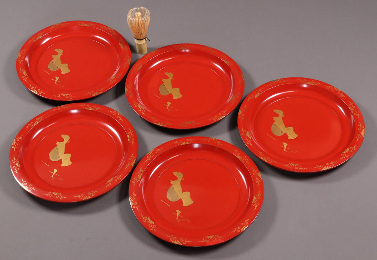 - MA417 輪島塗 木製漆器 金嚢楽器 金蒔絵 朱塗 八寸木皿 五客 24㎝ 梨地 大徳寺盆 菓子盆 茶懐石 プレート 天然木