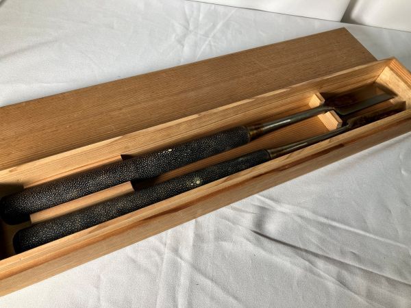- ☆突き鑿2点 鮫皮巻 「信光」の銘 大工道具 宮大工