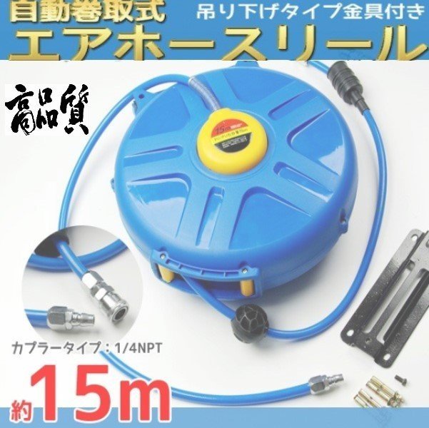 > 【送料無料】エアーホースリール 自動巻取式 吊り下げ式 ツールパワー 材質PU 15mのエアーホースを自由に引き出し使わないとき自動で巻き上