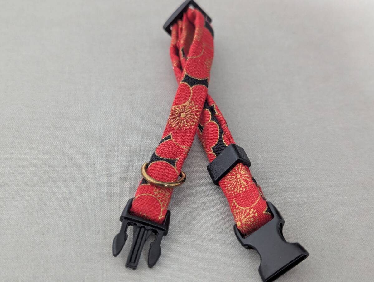 - ★手作り京都作家物 猫 首輪 和柄★黒地金糸目紅梅柄★ハンドメイド (セーフティタイプ) 即決700円
