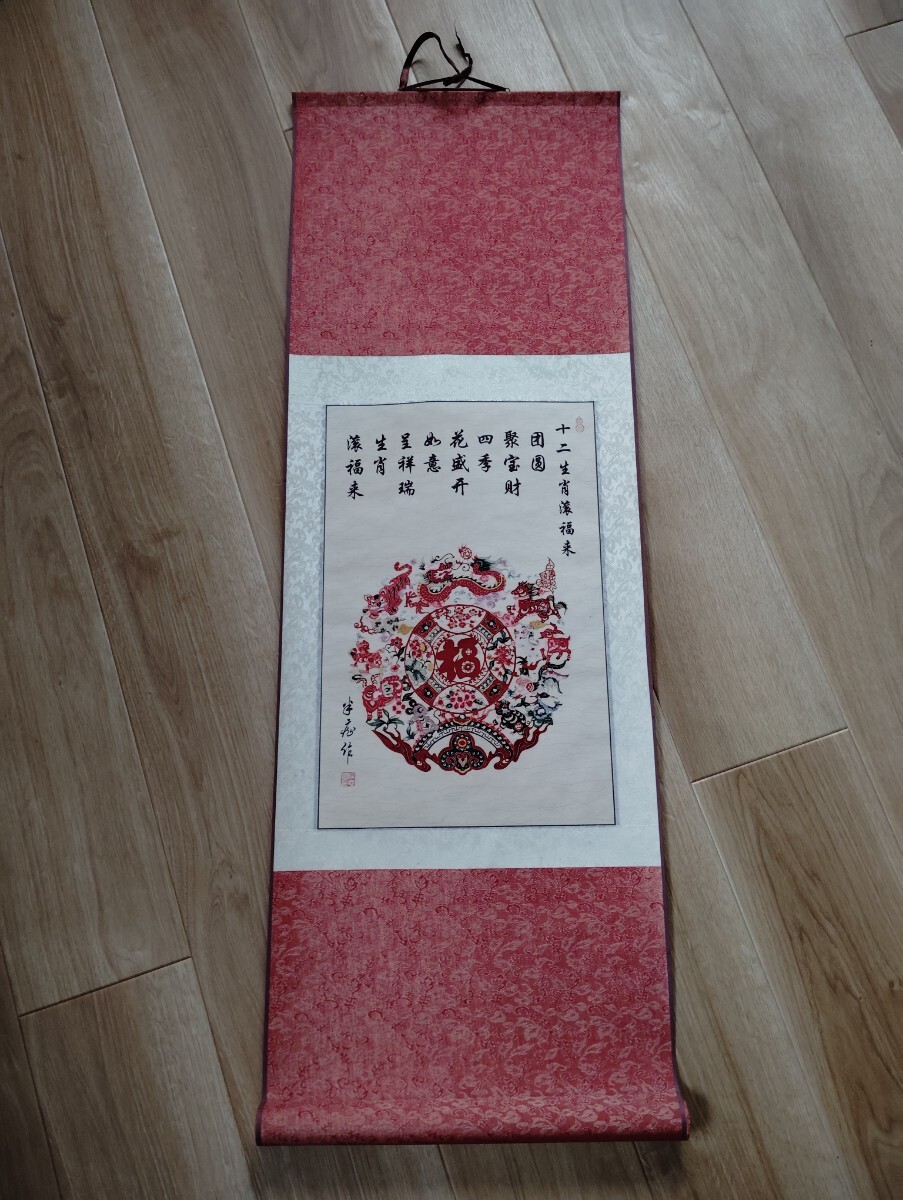- 美品 (12エド、福が来る)、カラフルな色彩でバランス良くデザインした中国剪紙(紙細工、切り紙)の掛け軸★★ 箱無 古美術