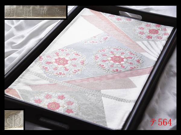 - 蔵【テ564】西陣逸品 振袖可 寿扇華紋 シルバー色地 気品豊かに 正絹純金糸六通高級美術袋帯 ◇検簪着物名古屋帯和装小物帯締め