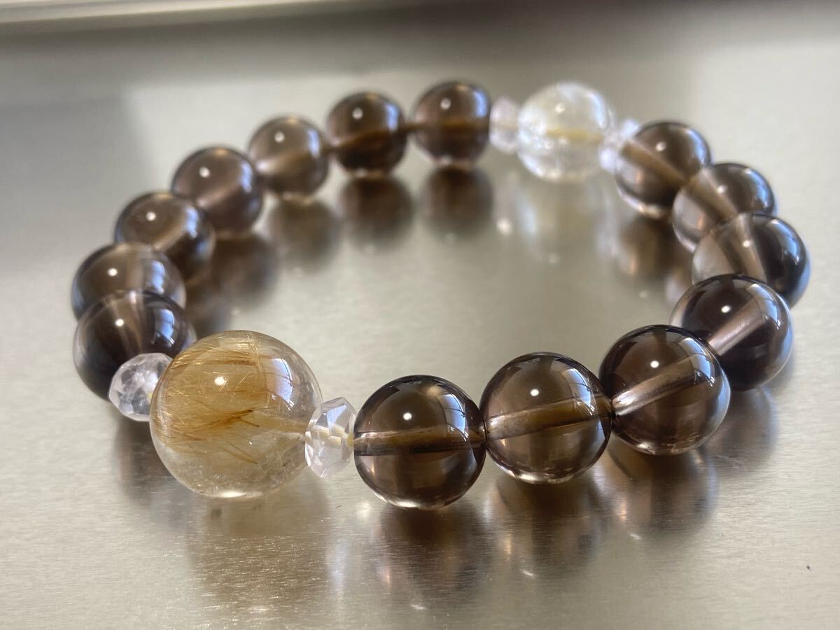 > 天然石 ブレスレット パワーストーン ルチルクォーツ スモーキークォーツ ローズクォーツ 一点物オリジナルブレスレット
