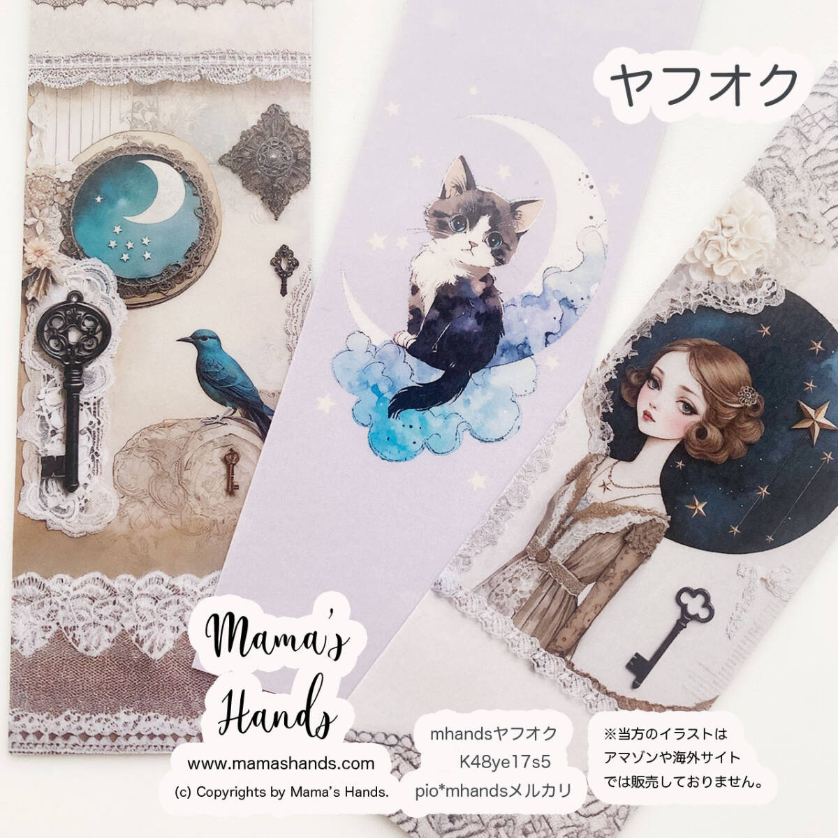 - ★即決★ 小鳥 月 猫 女の子 ビンテージ風 しおり 防水 硬い 長持ち 水彩画 読書 イラスト アート 3枚セット