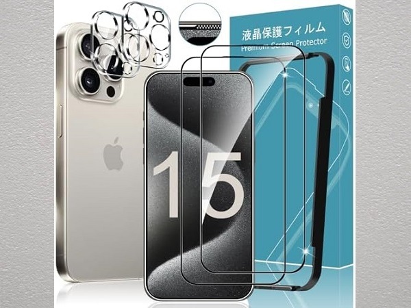 > PANDESS iPhone 15 Pro ガラスフィルム(2枚)+カメラフィルム(2枚)+ガイド枠セット 新品 9H硬度 スクラッチ 飛散 防止 高透過率 全面保護