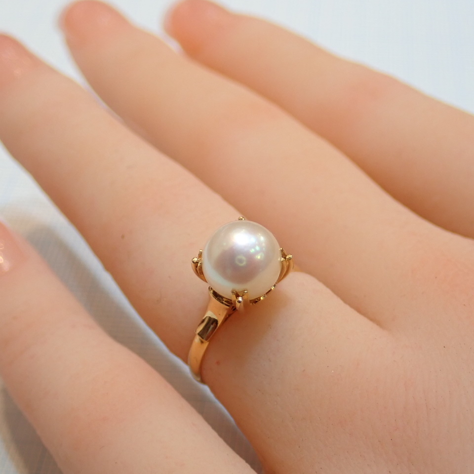 - ■K18 約8.2mm あこや真珠リング■アンティーク 昭和レトロ■穴透かし■パール 本真珠 アコヤ■指輪■中古磨き仕上げ■