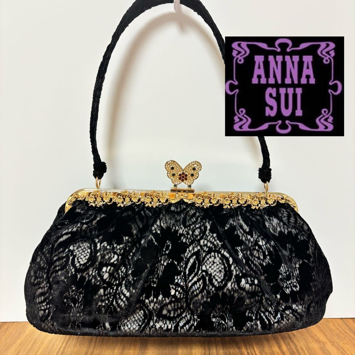 - 美品◇ANNA SUI◇アナスイ◇ベロアレース がま口ハンドバッグ◇BLACK