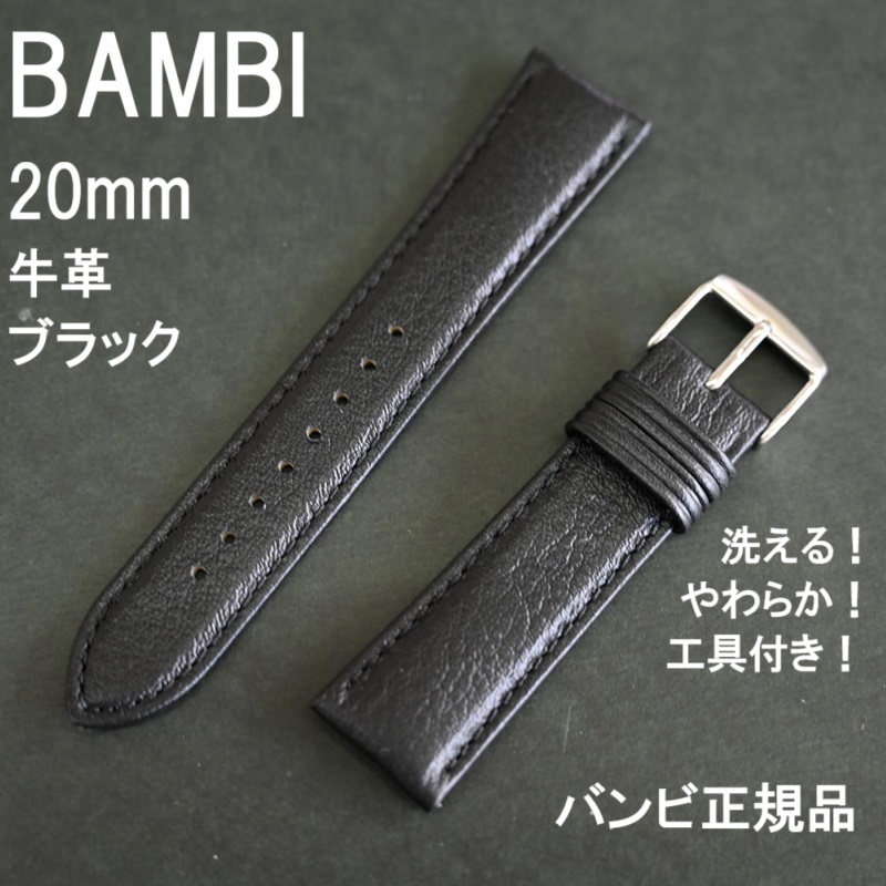 - 送料無料 バネ棒付き★特価 新品★BAMBI 時計バンド 20mm 洗える 牛革ベルト 黒 ブラック 柔らかい!★バンビ正規品 定価税込6,600円