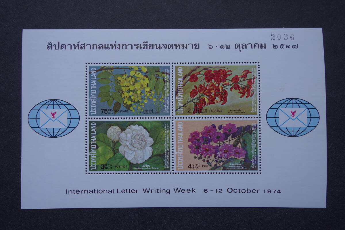 - 外国切手: タイ切手 「1974年 国際文通週間」(ゴールデンシャワー ほか)小型シート 未使用