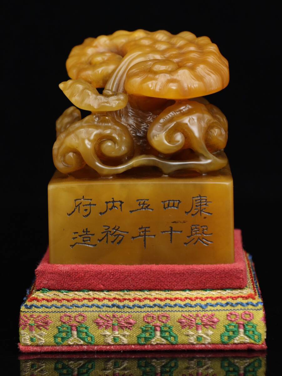 - ▽鴻▽ 寿山石 田黄石 細密彫 靈芝印章 箱付 置物 古賞物 中国古玩 中国古美術