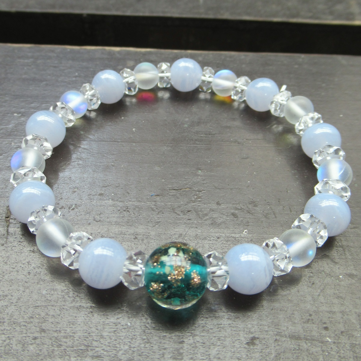 > 蓄光*ホタルガラスxブルーレースxルナフラッシュブレスレット 天然石 パワーストーン トンボ玉