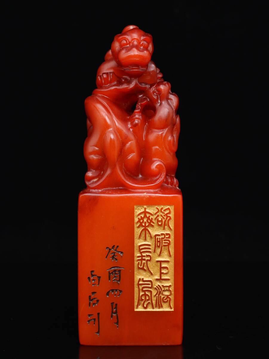 - ▽鴻▽ 寿山石 紅田黄石 細密彫 瑞獣印章 置物 古賞物 中国古玩 中国古美術