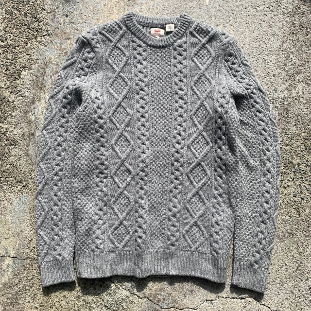 > 【L】Levi's ケーブル編み ウールニット セーター ライトグレー 無地■アメリカ古着 リーバイス フィッシャーマン ビッグサイズ