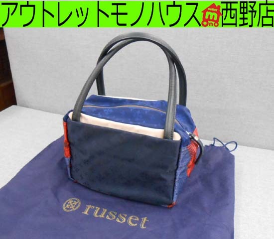 russet/ラシット キューブバッグ ネイビー ハイビスカス柄 異素材MIX 幅35 ハンドバッグ 鞄 札幌 西野店