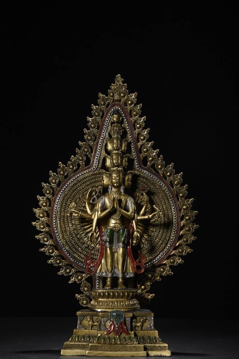 - 清時代 純銅彩絵千手觀音像 仏教古美術 仏教 密教 置物 供奉品 極細工 古賞物 古美味 東洋彫刻 時代物 骨董 中国古美術