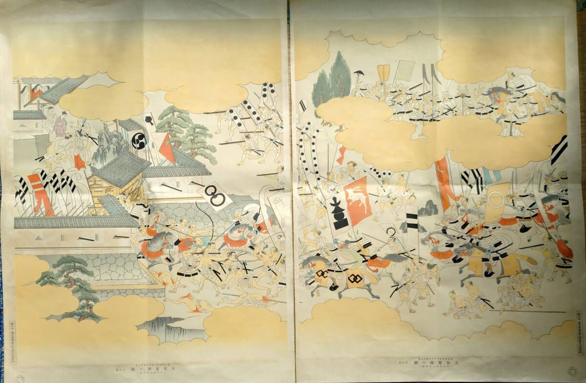 - f25022155〇石版画 大坂夏陣の図 2枚 東京帝国大学 歴史科教授用参考掛図 大正6年〇和本古書古文書