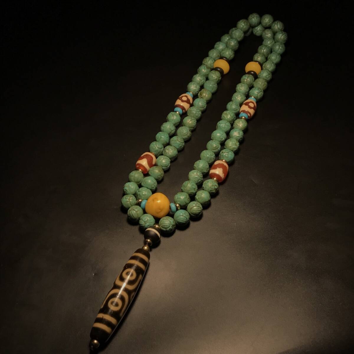 - 清時代 古天珠 綠松石 六眼天珠 ペンダント 吊墜 箱付 極細工 古賞物 古美味 東洋彫刻 時代物 骨董 中国古美術