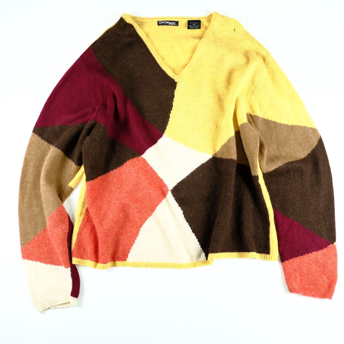 - 1980s ビンテージ ラムウール Vネックセーター パネル切り替えデザイン 古着屋 オーバーサイズ xxl アーガイル レアデザイン