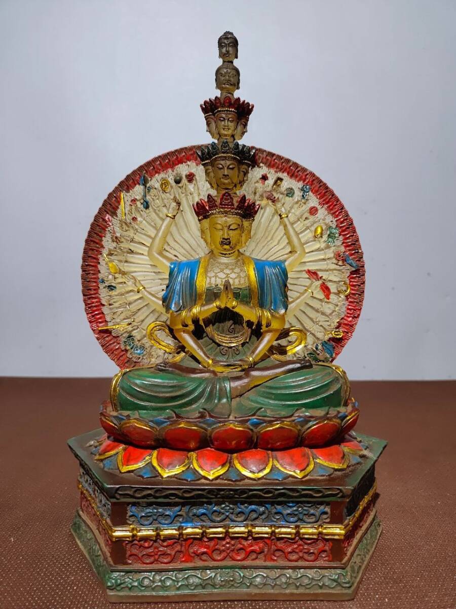 - ▽鴻▽ 琉璃製 細密彫 描金 彩繪 千手觀音像 置物 古賞物 中国古玩 中国古美術