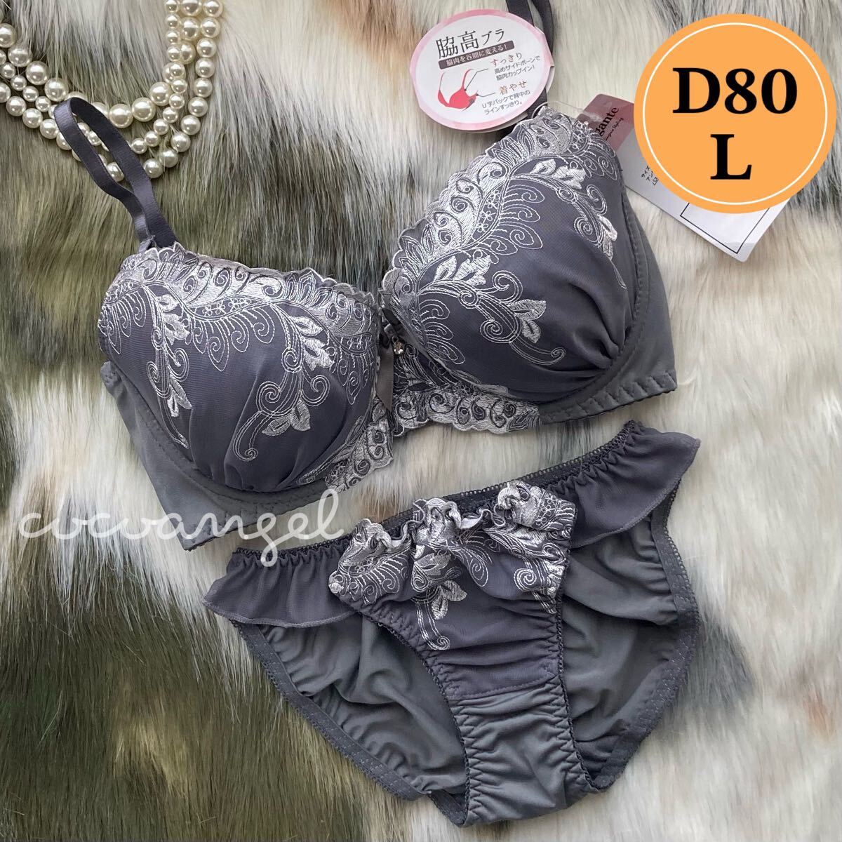 > 【D80L グレー 上下セット】新品 ブラ&ショーツ ブラジャーショーツ パッド付き 脇高 豪華刺しゅう 寄せ上げ かわいいパンティ Dカップ